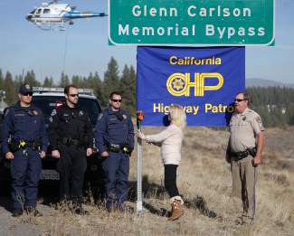 Officers with CHP and the Truckee Police Department honored Carlson Thursday morning by placing a bouquet of flowers at the CHP Officer Glenn Carlson Memorial Bypass sign, on the side of Highway 267 near Old Brockway Road.