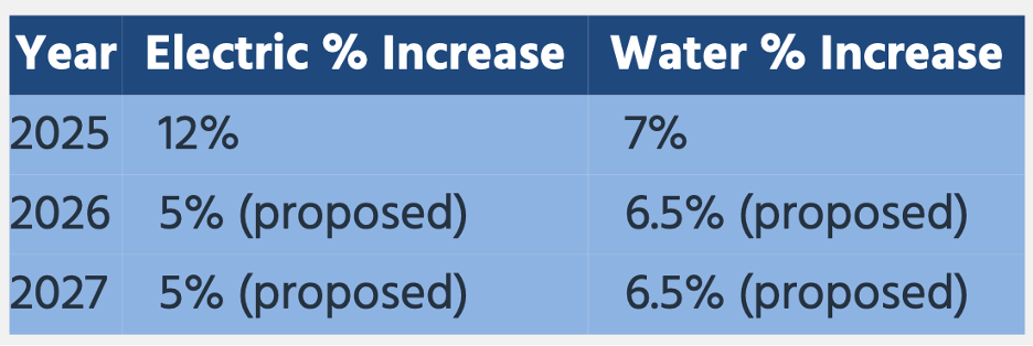 The proposed budgets include average water rate increases of 6.5% in both 2026 and 2027. Electric rates are proposed to rise by 5% in 2026 and another 5% in 2027. According to staff, these increases are needed to address aging infrastructure and fund timely capital replacement projects.