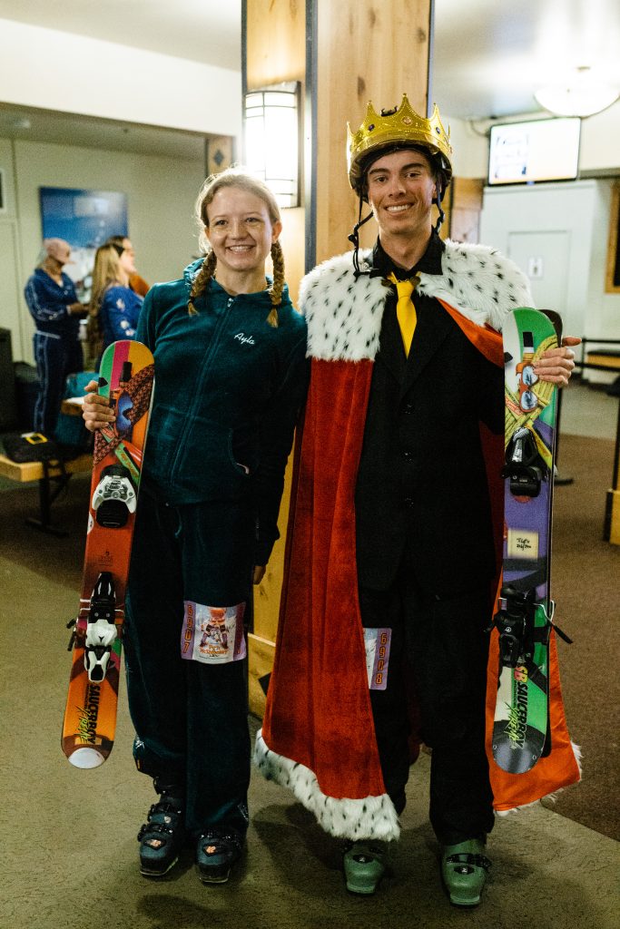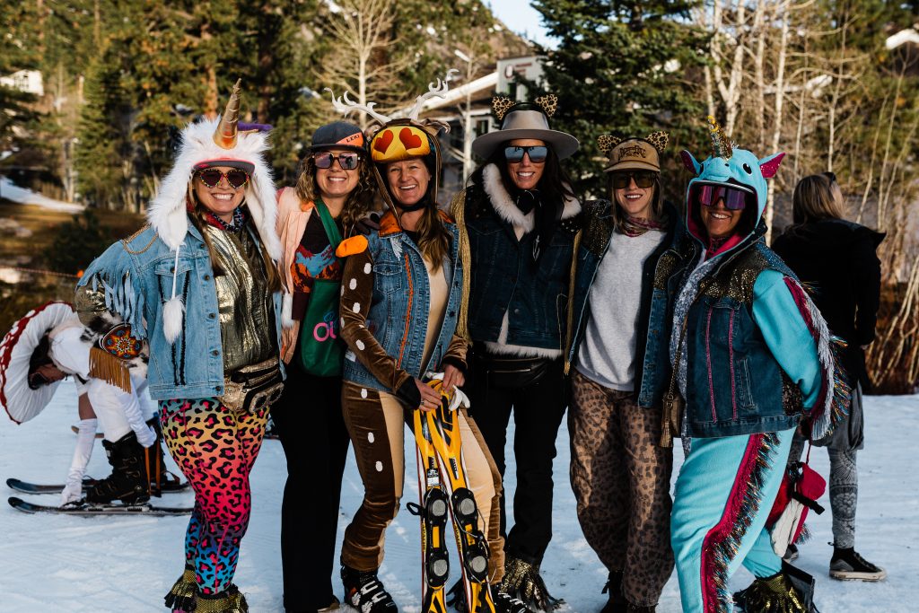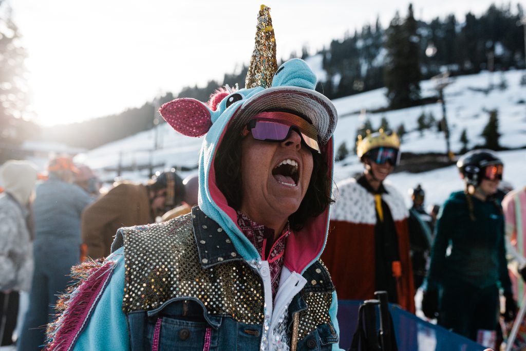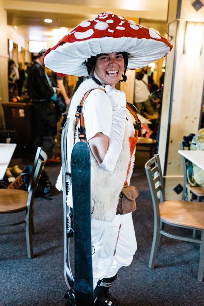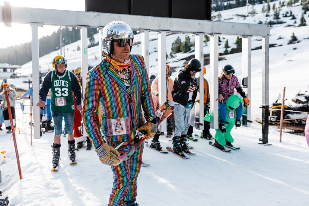 Once in the lift line, the energy didn’t stop as racers awaited their chariot. Then, one by one, full chairs ascended. Rather than drab helmets lined in a row, the costumes appeared as assorted candies being scooped up the mountain.