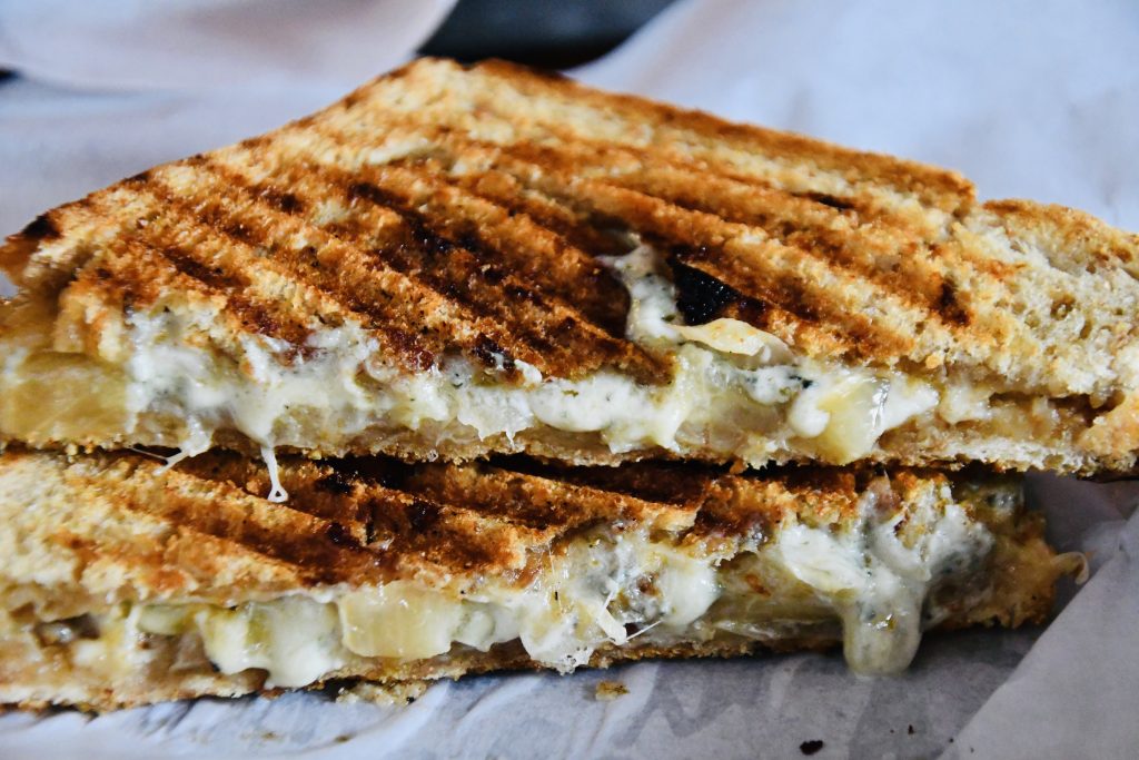 Two slices of multigrain bread and loaded with bleu cheese, provolone cheese, caramelized onions, and fig preserves before getting panini pressed and sliced in two. The ooey gooey melt-y cheese factor on this sando is at a full blown 10. Each bite has the cheesy pull and envelops the tender and sweet onions perfectly.
