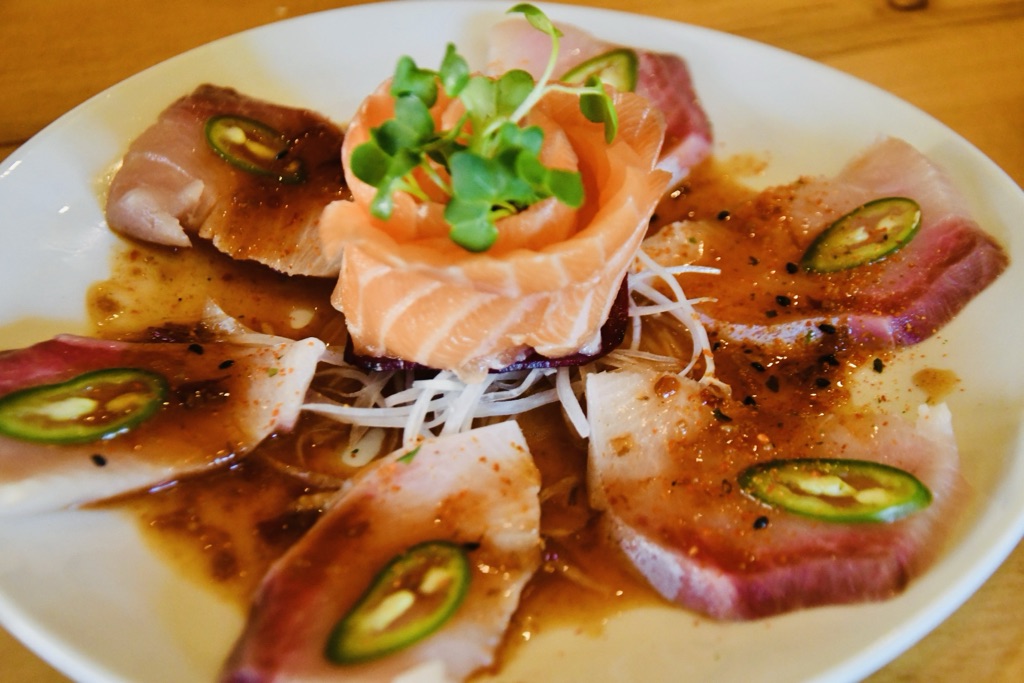 Listed on the menu as a chef’s special, it’s easy to see why. Thin slices of Hamachi are joined on the plate with red yuzu kosho, Shiro ponzu, sesame oil, and red radish then topped with paper thin serrano slices and togarashi.