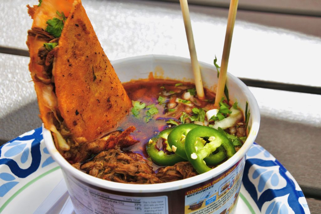 A bowl of Nongshim Premium Ramen (used to coincide with the local Latino community’s preferences) is prepared and then infused with the birria consommé. It’s topped with the slow-cooked beef and garnished with fresh jalapenos and cilantro and if that isn’t enough to get those jowls foaming, a quesabirria taco is plunged into the ramen, creating a dipping experience that’s beaming with creativity.