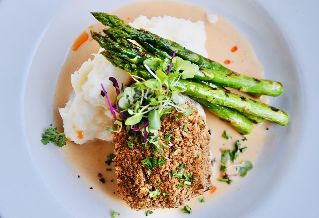 With the ocean doing most of the flavoring of the fish, it’s given just a simple treatment of salt and pepper before getting its pecan-crusted exterior. It is then oven roasted before being placed atop a tomato-shallot beurre blanc and surrounded by whipped potatoes and a seasonal veggie (asparagus in this case).