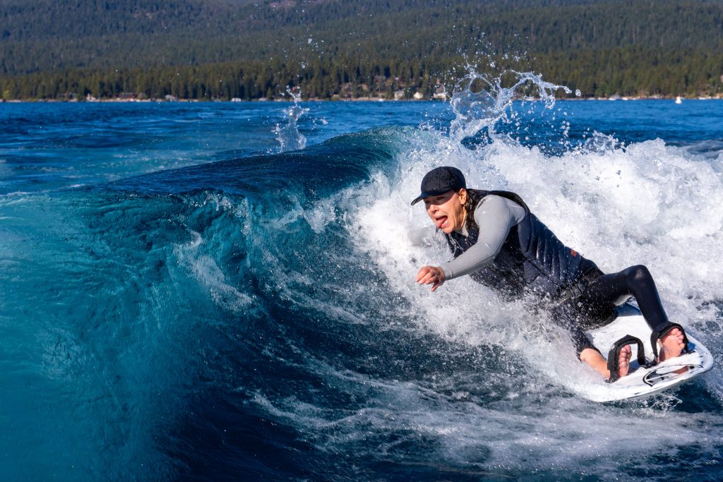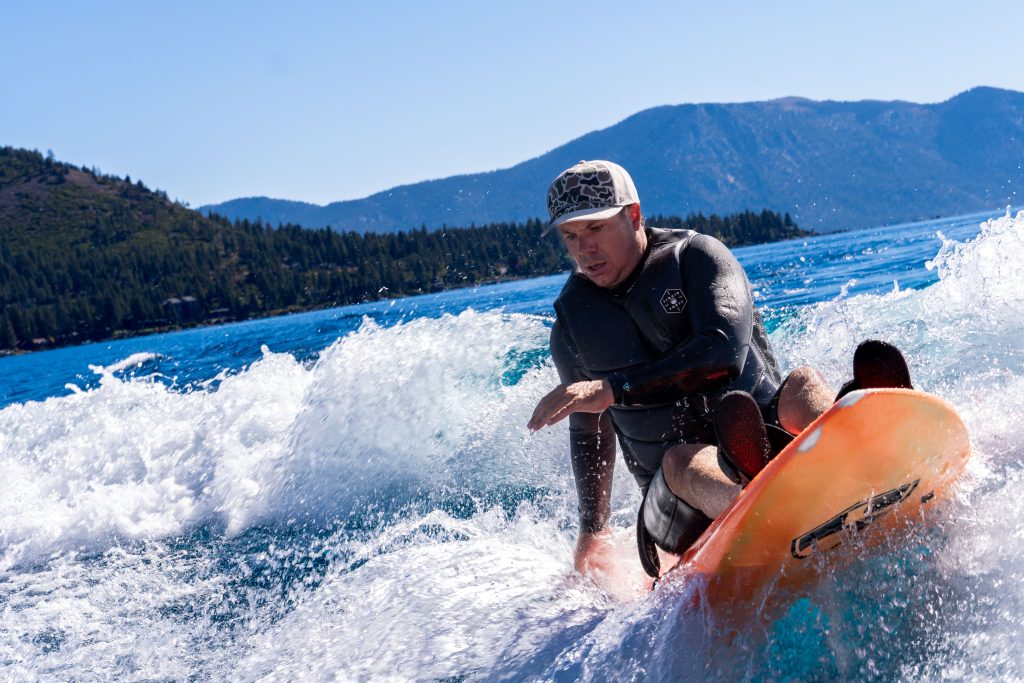 LAKE TAHOE, Calif./Nev. – The sun lit up Lake Tahoe’s blue waters as a MasterCraft boat rumbled across the lake. Onboard, athletes slipped into wetsuits, tightened life jackets and prepared to ride their wakesurf boards. Each one was different — customized with seatbelts or foot straps — and each athlete brought their own style, some balancing from a seated position, others steering with their hips.