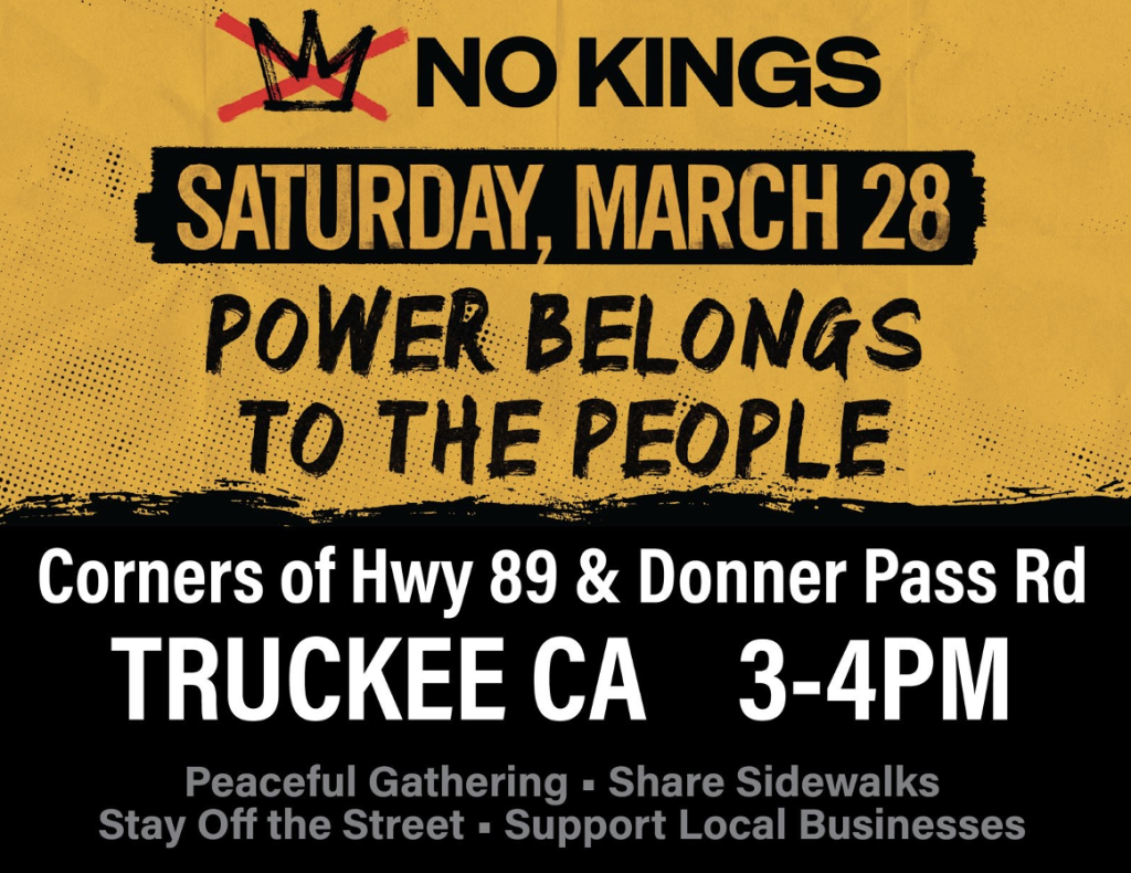 TRUCKEE, Calif. – People in the Truckee area will gather on Saturday, March 28 for a peaceful No Kings demonstration, joining over 3,000 protests and rallies around the nation voicing opposition to the Trump administration and its policies.