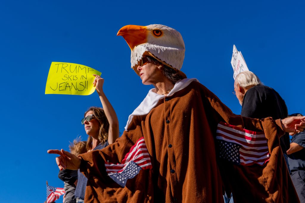 TRUCKEE, Calif. — Music drifted down Donner Pass Road as families pushed strollers, dogs wagged their tails and a line of costumed protesters walked through Truckee on Saturday afternoon. Beneath bright fall skies, hundreds gathered with handmade signs and flags for the town’s latest “No Kings” demonstration — one of thousands that unfolded across the country this weekend.