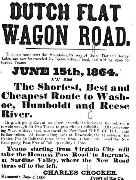 Ambitious men like Leland Stanford, Collis P. Huntington, Mark Hopkins, and Charles Crocker – the financial backbone of California’s Central Pacific Railroad and known to history as the Big Four – are rarely satisfied with any one business deal, no matter how grand or complex. As the principle directors of Central Pacific, the Big Four knew that once the transcontinental railroad was completed, they would control virtually all transportation and shipping into Northern California and Nevada. But they also realized that in the meantime, they were missing out on the lucrative stage and wagon-hauled freight between Sacramento and the Comstock mining boom.Central Pacific had already constructed a rough road to carry men and track materials eastbound from Sacramento into the Sierra, but Huntington envisioned a well-surfaced toll road from the west slope town of Dutch Flat to Donner Lake, and then onward to the Carson Valley. Huntington believed that this direct, high-quality route would monopolize the mining traffic and take business from the primary commercial road via Carson Pass, between Placerville and Virginia City, Nev. Huntington had an opponent in the railroad’s chief engineer, Theodore D. Judah, who argued vociferously against such a road, fearing that its construction would siphon money from Central Pacific’s trans-Sierra railroad effort, which he considered paramount. Judah also worried that the Big Four might decide to build the railroad only as far as Dutch Flat, where it would meet the heavy toll road traffic coming from the Nevada mines.