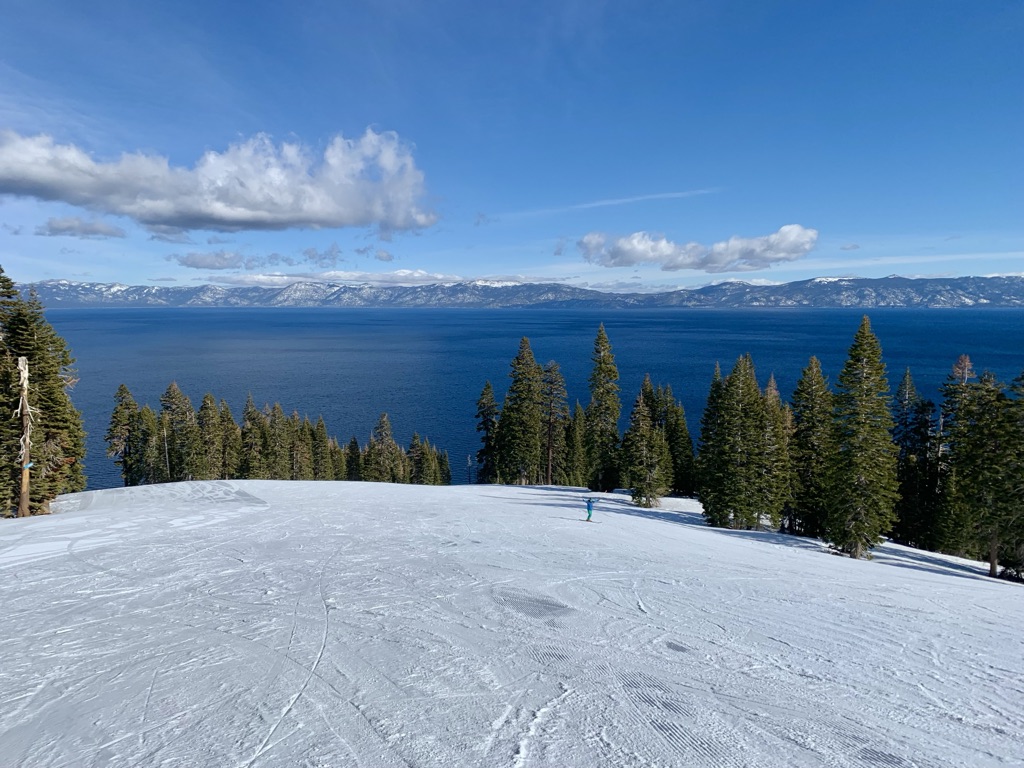 Homewood has eight ski lifts with a capacity of 8,238 passengers per hour, including one quadruple chair, three triple chairs, and four surface lifts. The resort sits at 7,880 feet elevation with 1,600 vertical feet of skiable terrain, offering views of Lake Tahoe. The 411 acres include 62 ski trails, with 12.9% beginner, 70.2% intermediate, and 16.9% advanced slopes.