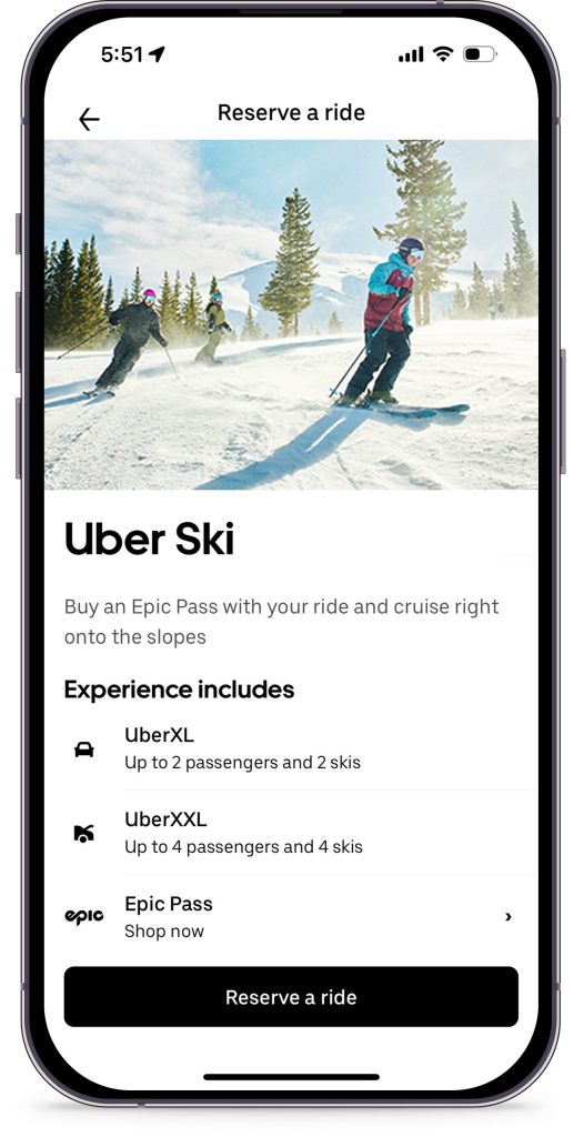 Uber Ski has partnered with Vail Resorts, offering Epic Pass or Epic Day Pass purchase options directly through the Uber app. Tapping the Epic Pass option in Uber’s app reveals all the purchase options, including unlimited, unrestricted access passes, day passes or Epic 1-7 Day Passes, which saves up to 65% off daily lift tickets.